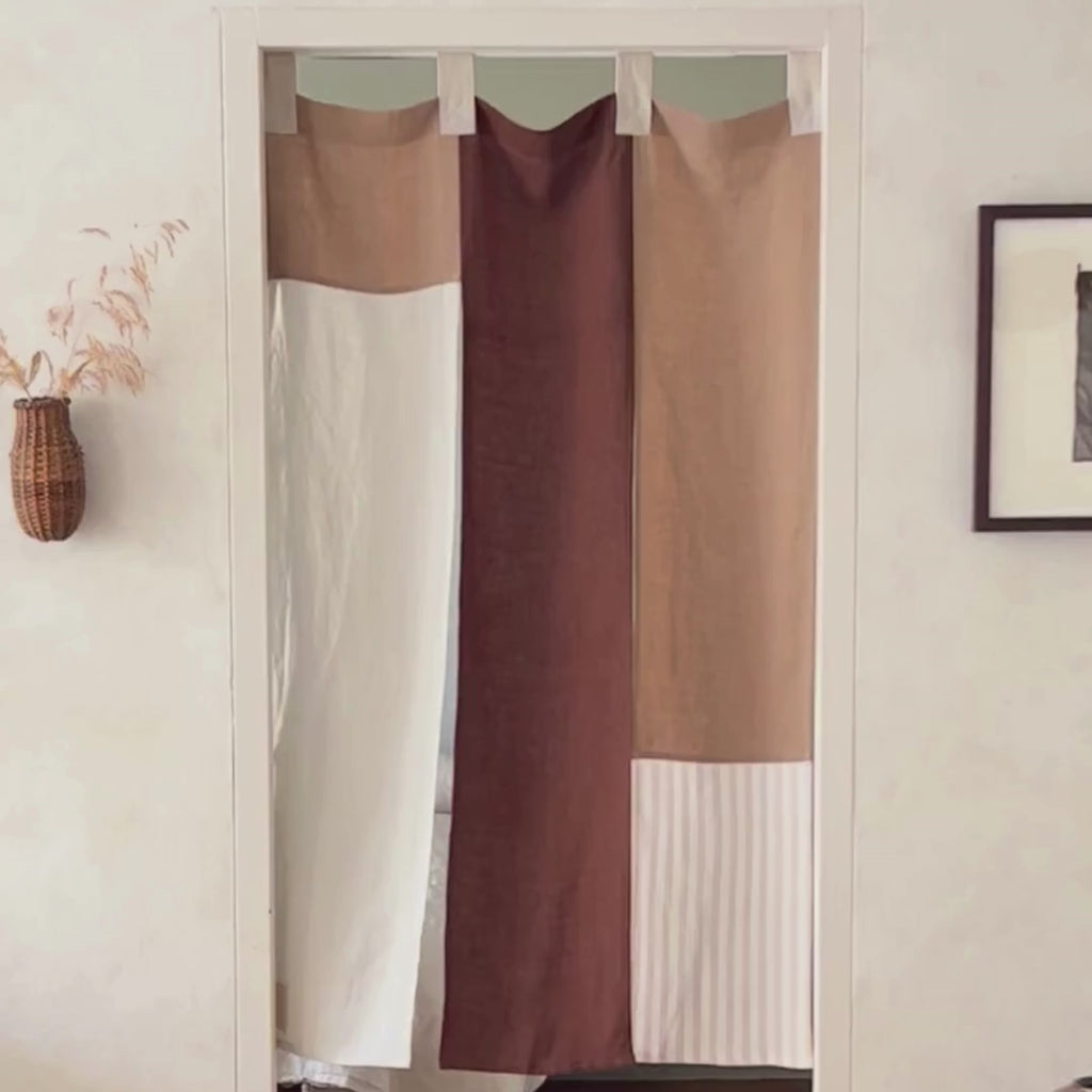 This Noren curtain is 1 of only 4. Made from IN BED European linen in Cocoa, Dove Grey, Chestnut & Walter Stripe. Upcycled fabrics have been patch-worked together with French seams, complete with a small IN BED label. Best suited as a door curtain.